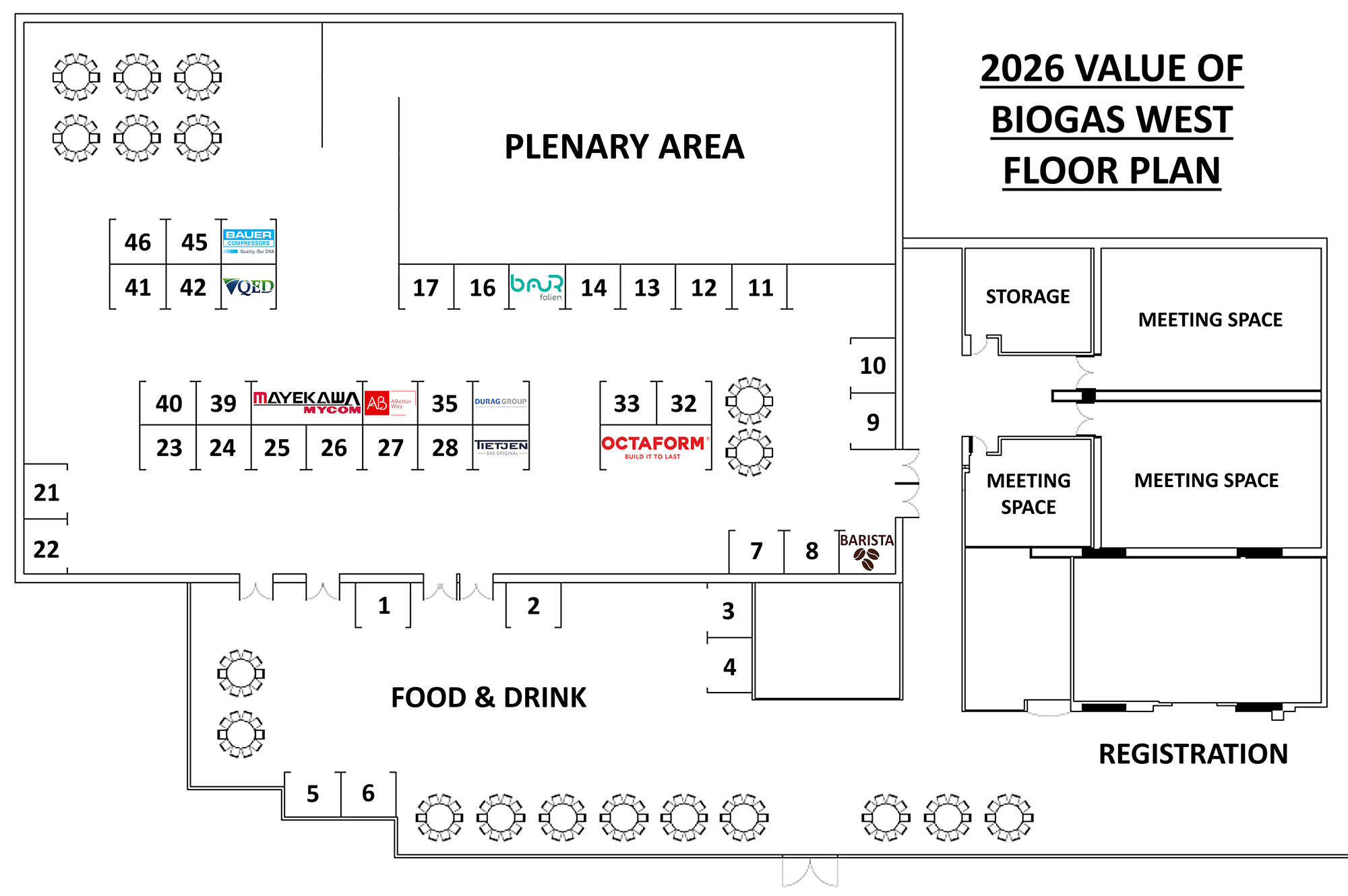 2026 Value of Biogas West offers a complete exhibitor expo. Each exhibitor space is 10 feet wide by 8 feet deep, with an 8-foot high backwall and 3-foot-high sidewalls. All exhibitor spaces come will a 6-foot-long skirted table, two chairs and electricity (for plugging in electronics) free of charge.